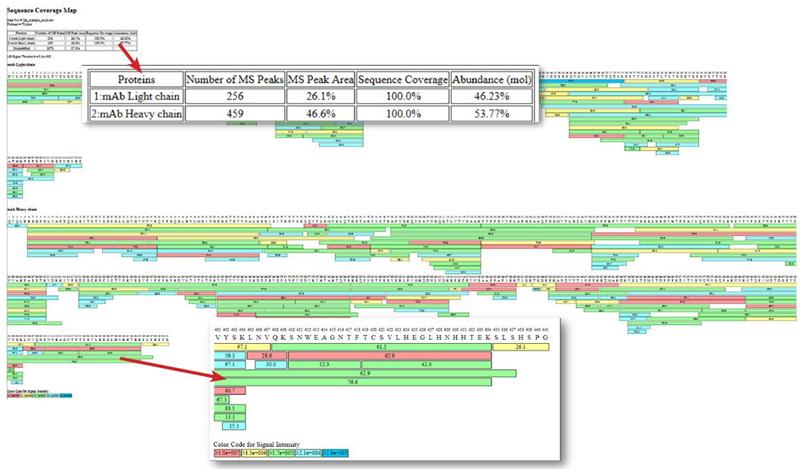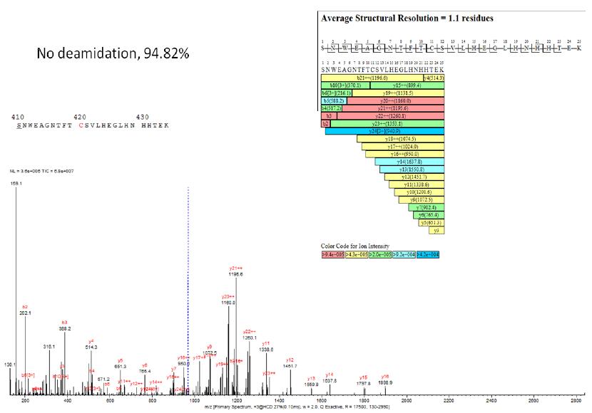 圖1顯示了PepFinder搜庫得到的序列覆蓋度結果,圖中不同顏色代表信號強度。從圖中可以看出,單抗標準品的輕重鏈覆蓋度均達到了100%;PepFinder還可對脫酰胺進行定量,這對于生物醫(yī)藥分析人員是非常有用的。圖2顯示了PepFinder生成的修飾情況總結;圖3展示了一條包含脫酰胺修飾肽段SNWEAGNTFTCSVLHEGLHNHHTEK的定性以及定量情況。