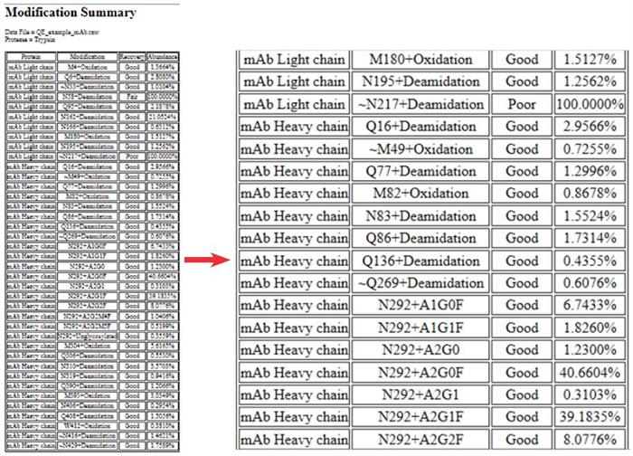 在PepFinder軟件中,只要導入單克隆抗體的序列,即可自動計算出該抗體的重鏈末端K丟失后分子量、還原后(未還原)輕/重鏈分子量、無糖/脫糖重鏈分子量和各種常見糖型重鏈分子量等(圖6);目前,此功能為PepFinder軟件獨有,其他類似軟件尚無此功能。