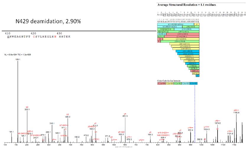 從圖3中可以看出,使用PepFinder軟件可獲得連續(xù)的肽段碎片離子,提高了鑒定結果的可靠性;分別對N416和N429兩個可能發(fā)生脫酰胺修飾的位點進行定量,可以得到N416的脫酰胺比例為2.28%,N429的脫酰胺比例為2.90%。對于生物醫(yī)藥行業(yè)分析人員,脫酰胺修飾量的變化是藥物穩(wěn)定性測試的重要參數,PepFinder軟件可提供精確到位點的脫酰胺定量信息,為分析人員提供有力參考。