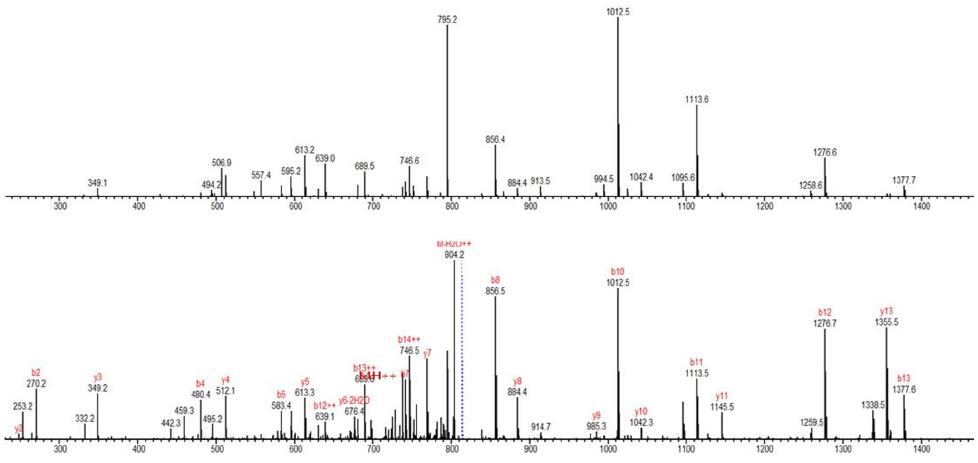 圖7 PepFinder軟件預測的二級譜圖與實測二級譜圖的對比。上,預測二級譜圖;下,實測二級譜圖。