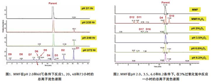 本文研究了霉酚酸酯 API 在 pH 2.0、 3.5、 6.0 和 8.2 條件下的熱和過(guò)氧化氫降解。采用臺(tái)式高分辨率質(zhì)譜儀 Q Exactive Focus與 UHPLC 系統(tǒng)聯(lián)用快速準(zhǔn)確地分析了降解產(chǎn)物,見圖 1、 2 和 3。