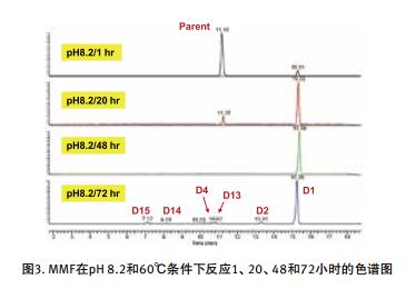 ● 用如上 pH 2、 pH 6、 pH 8 的溶液和過(guò)氧化氫(3%, pH 8.2)將濃度為 2.5 mg/mL 的霉酚酸酯儲(chǔ)備液稀釋 10倍配制濃度為 0.25 mg/mL 的強(qiáng)制降解溶液。強(qiáng)制降解溶液放置于 60℃烘箱中。在放置的第 1、 20、 48 和 72小時(shí)分別取樣,直接進(jìn)樣到 LC/MS 中進(jìn)行分析。