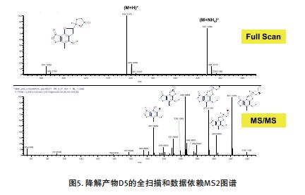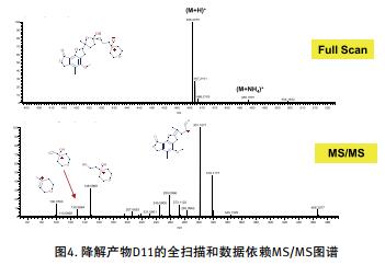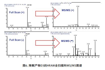 ● 全掃描和 MS/MS 模式下的正 / 負(fù)離子切換模式能全面鑒定降解產(chǎn)物,如圖 4 和 5 所示。