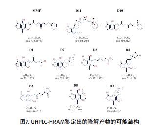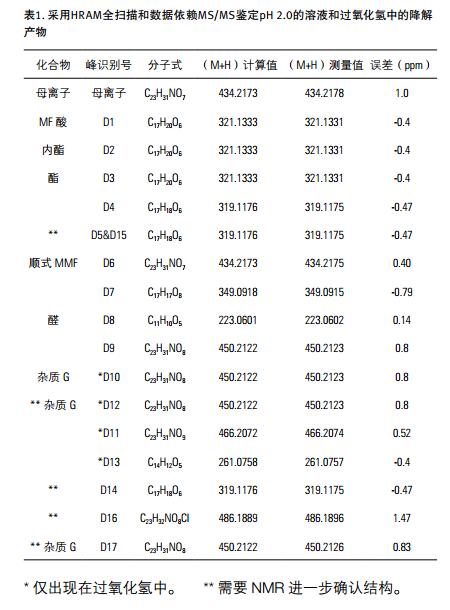 UHPLC 系統(tǒng)和臺(tái)式 Orbitrap Q Exactive FocusTM 質(zhì)譜儀,數(shù)據(jù)處理采用 Mass FrontierTM 軟件。霉酚酸酯在熱和過(guò)氧化物催化下的降解研究的 pH 值設(shè)定為 2.0、 3.5、 6.0 和 8.2。采用 HRAM 全掃描和數(shù)據(jù)依賴MS/MS 在高分辨率和極性切換模式下實(shí)現(xiàn)降解產(chǎn)物的快速鑒定。 HRAM MS 和 MS/MS 譜圖以及正 / 負(fù)離子模式切換,能可靠完成降解產(chǎn)物的定性和結(jié)構(gòu)鑒定。