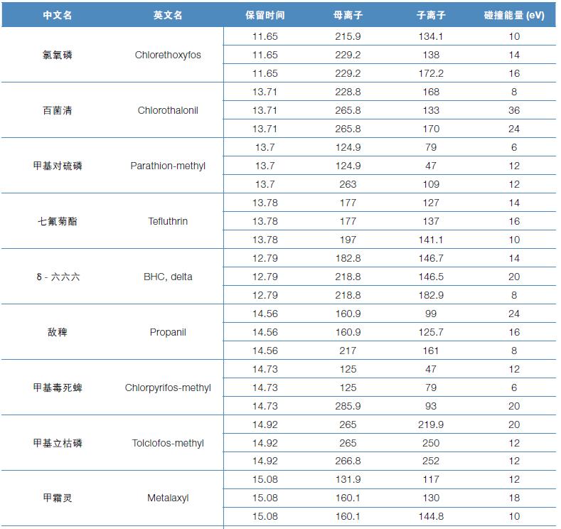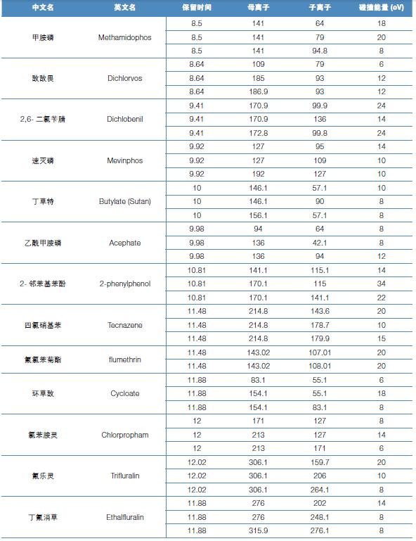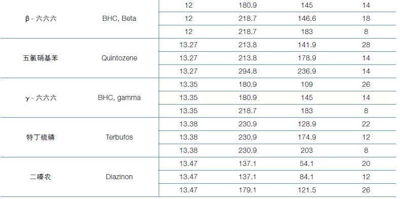 以 S/N=3 為計(jì)算最低檢測限,結(jié)果見表 2。圖 2 列出來部分 1 μg/L 的除害劑的色譜圖?梢钥闯,農(nóng)殘的檢出限基本上低于 1.0 μg/L,足以滿足現(xiàn)行國標(biāo)以及國際上除害劑檢測方法的要求,可保證樣品中除害劑的定性與定量檢測。