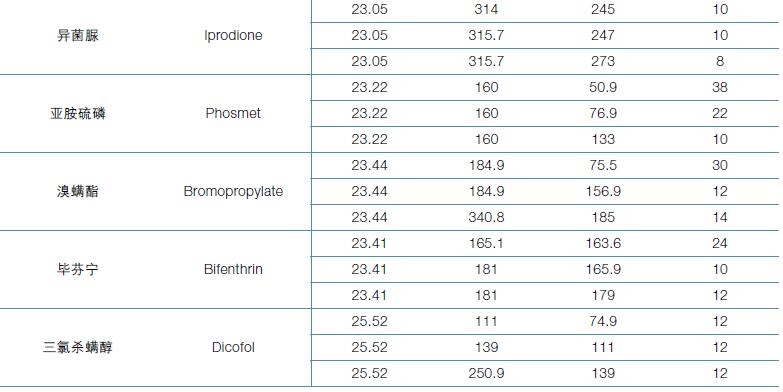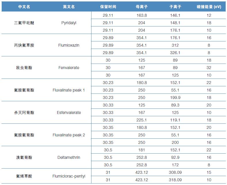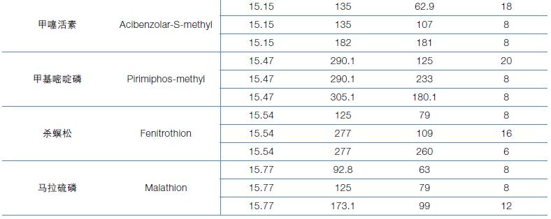 柱溫箱:40 ºC 保持 1.5 min,以 25 ºC/min 升至90 ºC,保持 1.5 min,再以 25 ºC/min 升至 180 ºC,以 5 ºC/min升至 280 ºC,最后以 10 ℃ /min 升溫到 300 ℃,保持 5min。進(jìn)樣口:不分流進(jìn)樣,不分流時(shí)間:1.5 min;進(jìn)樣口溫度:270 ºC;載氣:恒流,1.2 mL/min;傳輸線:300 ºC質(zhì)譜方法:離子源溫度為 300 ºC,采用 Acquisition-Timed方法,SRM 掃描,具體檢測離子對如表 1 所示:
