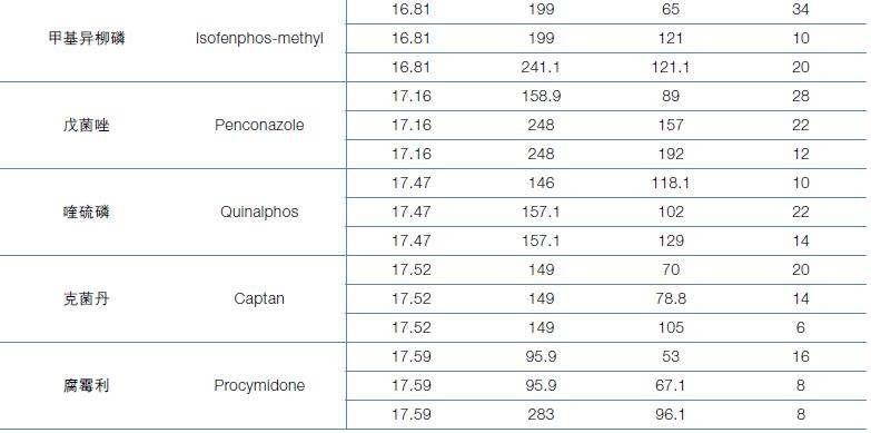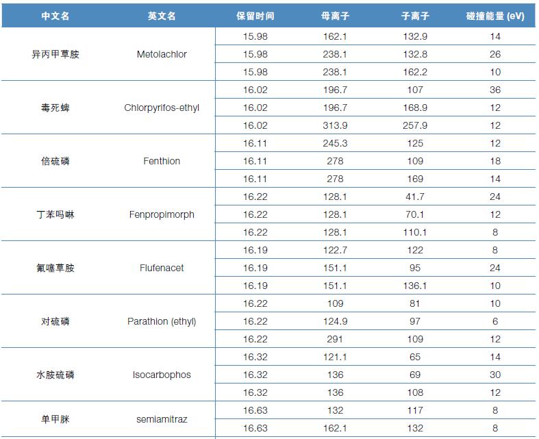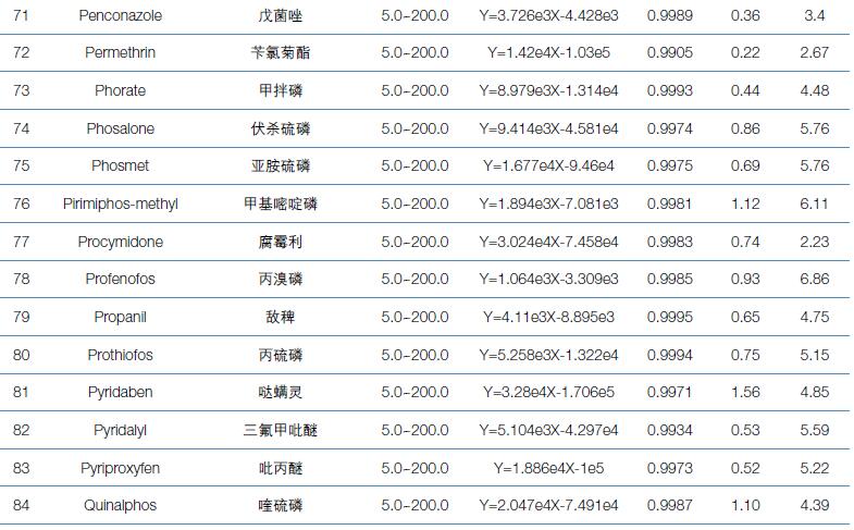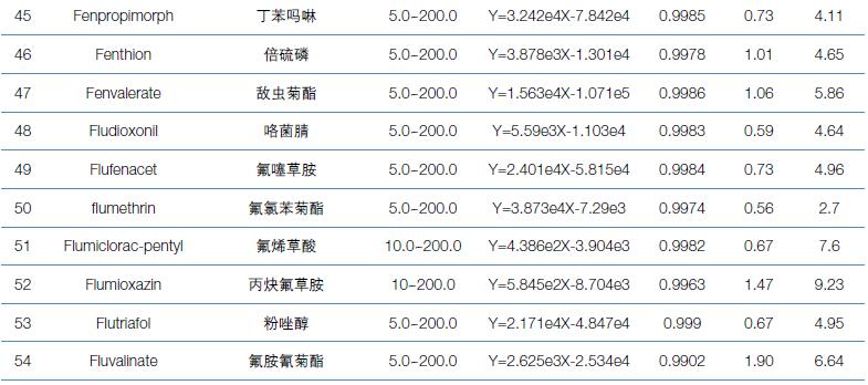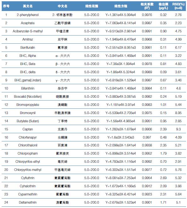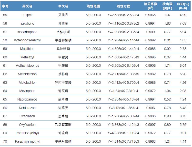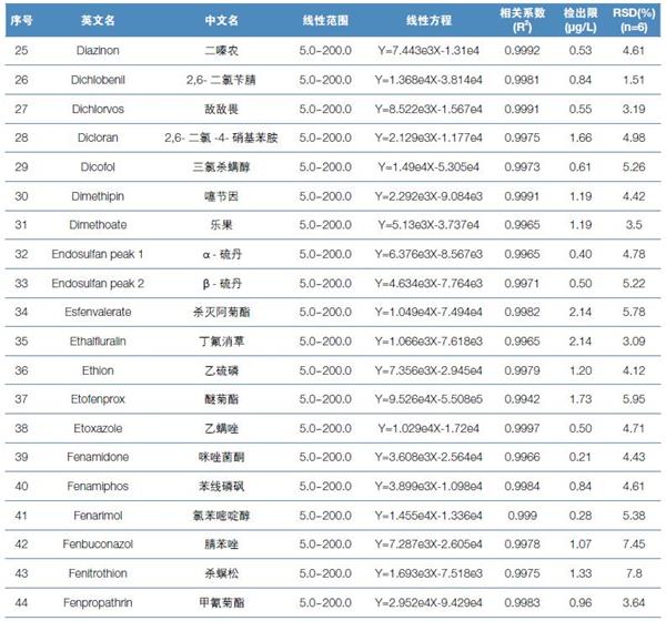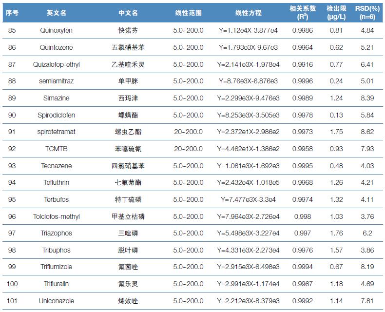 配置混合標(biāo)準(zhǔn)溶液,各濃度分別為:5.0、10.0、20.0、50.0、100.0 和 200.0 μg/L 采用上述方法分別進(jìn)樣分析,考察各組分的線性。實(shí)驗(yàn)結(jié)果表明 101 種農(nóng)藥組分在 5.0-200.0 μg/L 線性關(guān)系良好,線性相關(guān)系數(shù)均大于 0.99(見表 2),對同一樣品連續(xù)進(jìn)樣 6 針,RSD 在 1.51-9.3% 之間,重復(fù)性良好。按照 IUPAC 方法規(guī)定計(jì)算各組分檢出限,各組分檢出限在 0.07-2.69 μg/L 之間(見表 2),基本上滿足現(xiàn)行方法對于農(nóng)殘分析(檢出限 10 μg/L)的要求。