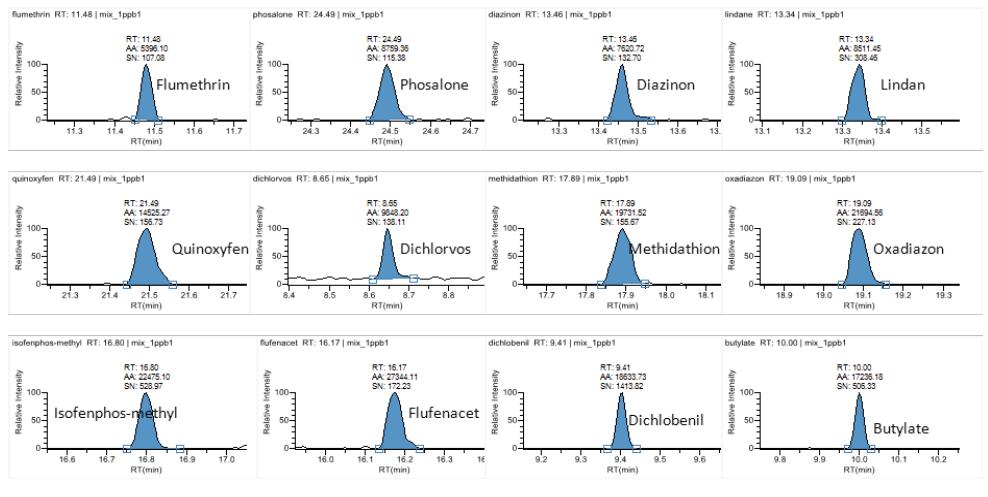 圖 2:1 μg/L 部分農(nóng)殘的色譜圖