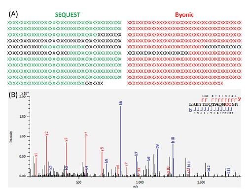 圖3. (A) SEQUEST/Byonic序列鑒定覆蓋度對比;(B) Byonic對肽段二級譜圖匹配