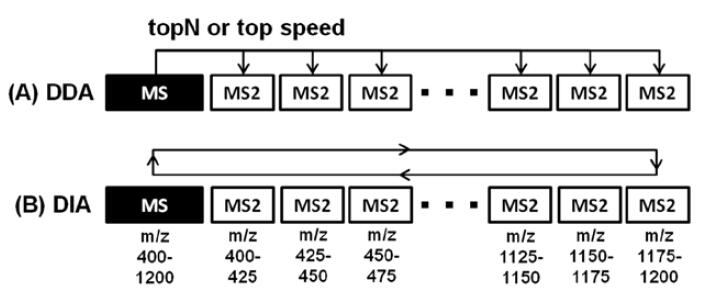 FIGURE 1. Schematic comparison of data dependent (A) and data independent (B) acquisition methods on ultra-high field Orbitrap platforms.