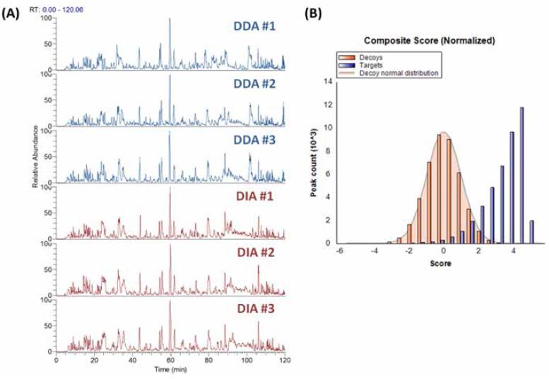 DDA ID results were imported into Skyline as spectral library for DIA data processing. mProphet was used to perform statistical analysis of targets and decoys, and generated Q value for result refinement (Figure 2C). DDA IDs with q < 0.01 (Percolator) and DIA IDs with Q value < 0.01 were extracted as