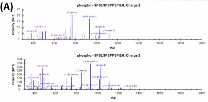 FIGURE 8. Example peptides with identical sequence and mass but different phosphorylation site. (A) Correct peak assignment was obtained due to high data quality.