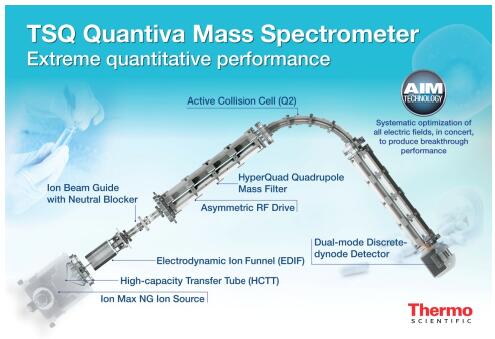 TSQ Quantiva 是賽默飛世爾科技在2013 年ASMS 上推出的全新一代三重四極桿質(zhì)譜儀。TSQ Quantiva 采用主動離子管控技術(shù)(Active Ion Management,AIM)(圖1)技術(shù)優(yōu)化離子生成及從離子源至檢測器的傳輸,使這款儀器能夠以最優(yōu)異的靈敏度定量分析最復(fù)雜和最具挑戰(zhàn)性的樣品。本實(shí)驗旨在考查TSQ Quantiva 在復(fù)雜基質(zhì)中針對目標(biāo)肽段定量的靈敏度。
