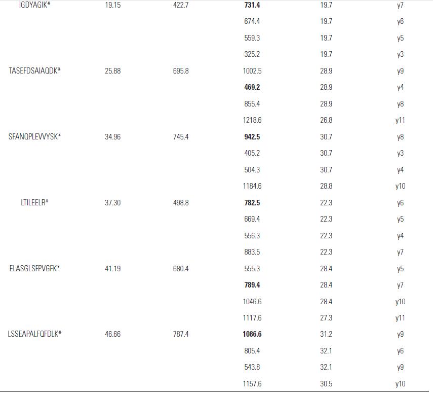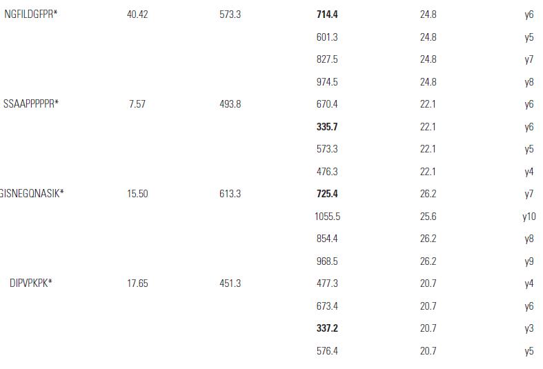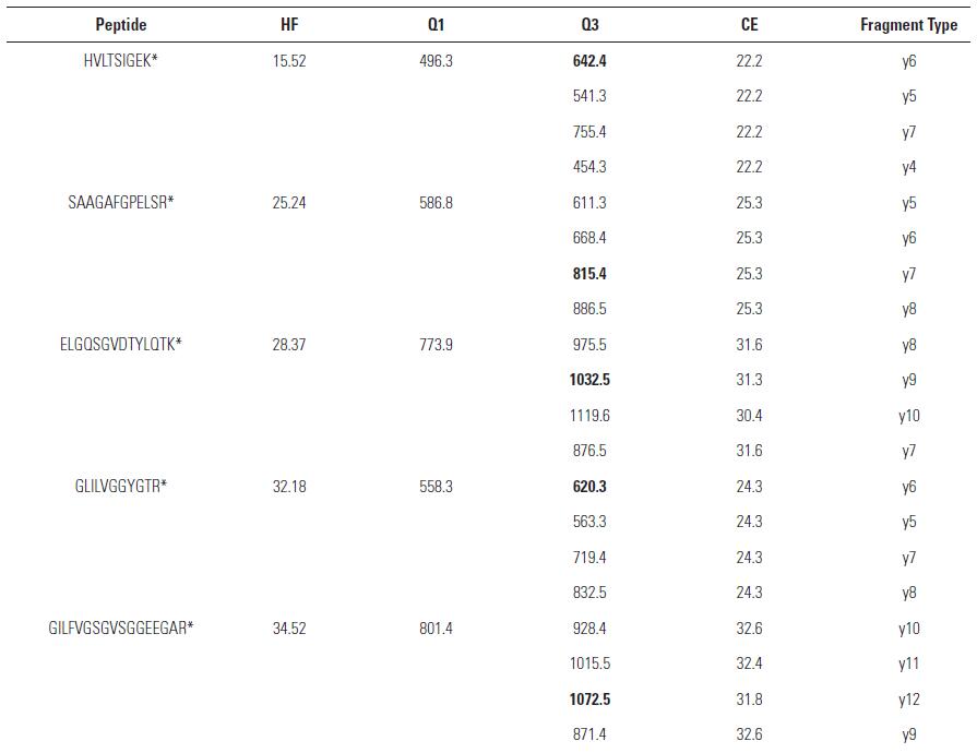 PIERCE Peptide Retention Time Calibration Mixture(貨號: 88320),內(nèi)含15 條不同疏水系數(shù)(Hydrophobicity Factor, HF)的重標(biāo)肽段。采用5ng/μL E.coli 酶解產(chǎn)物進(jìn)行逐級稀釋,獲得濃度為0.0005 fmol/ μL, 0.0025 fmol/ μL, 0.005 fmol/ μL, 0.05 fmol/μL, 0.5 fmol/ μL, 5 fmol/ μL, 50 fmol/ μL 的樣品。實(shí)驗中通過Pinpoint 1.3 軟件進(jìn)行離子對的選擇(圖2),每個母離子選擇4 個子離子,其中1 個子離子作為定量離子,3 個子離子作為定性離子。最終建立了15 條目標(biāo)肽段,共計60個離子對的SRM 方法,其中加粗部分為定量離子(表1)。