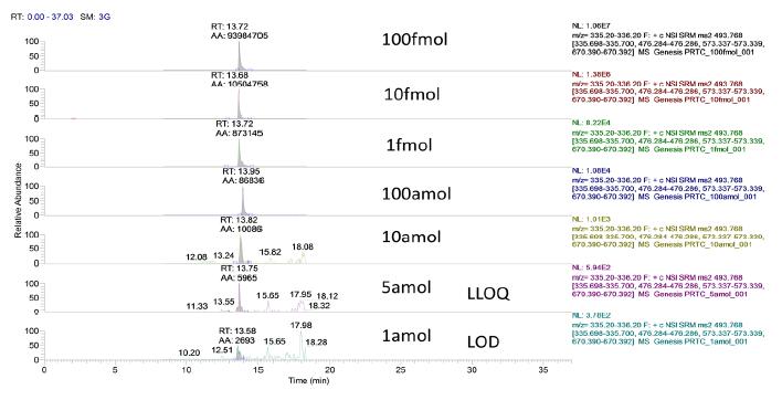 圖4. 肽段SSAAPPPPPR* 不同上樣量提取離子流圖(EIC)m/z493.8-> m/z 335.7
