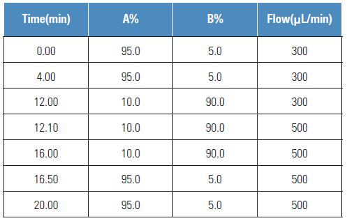 流動(dòng)相:A: 0.1% 甲酸水溶液,B: 0.1% 甲酸乙腈溶液梯度如下,其中前四分鐘為在線除鹽過程: