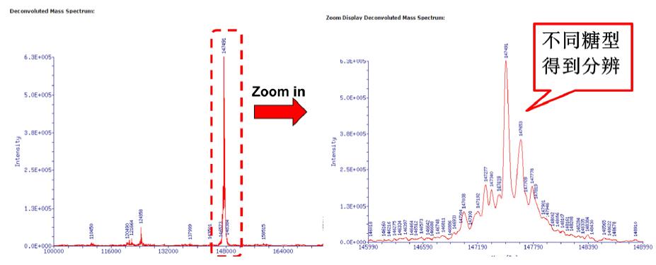 在本文的研究中我們使用Velos Pro 雙壓線性離子阱質(zhì)譜,對完整單克隆抗體及其輕重鏈分別進(jìn)行了分子量測定。實(shí)驗(yàn)結(jié)果表明,離子阱質(zhì)譜也能對150kDa 的完整單克隆抗體進(jìn)行分子量測定,且不同糖型可得到分辨。