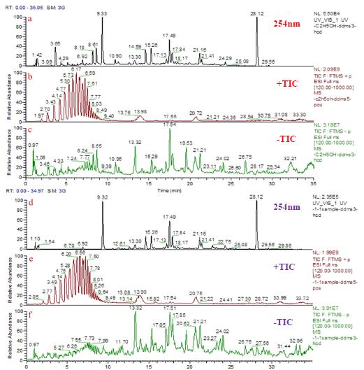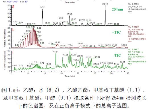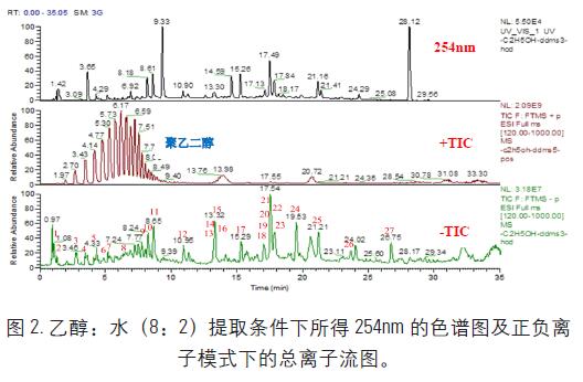 3.2 本實驗中乙酸乙酯:甲基叔丁基醚(1 : 1)和甲基叔丁基醚:甲醇(9 : 1)提取出的樣品成分相似。乙醇:水(8 : 2)在9 min 前出現(xiàn)了一些酚酸類化合物,其提取效率較高。