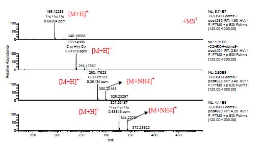 圖3. ESI 正離子模式下1.97,2.70,3.43,和4.14min 處峰的一級質(zhì)譜圖。