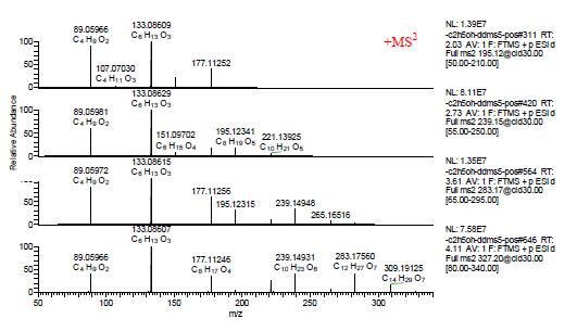 圖4. [M+H]+ m/z 195.12283,239.14906,283.17523,和327.20157 的二級質(zhì)譜圖。