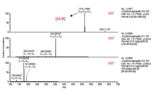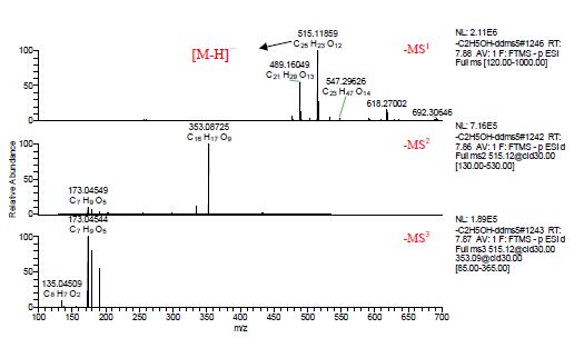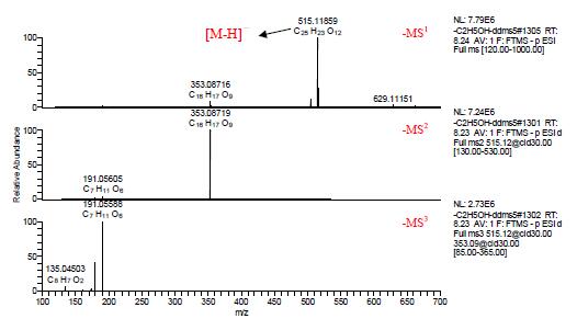 成分9,10 和11 的多級質(zhì)譜如下圖5,6,和7 所示,負離子模式下均可見[M-H]- m/z 515.11859。在負離子模式下,以C,H,O,和N 在1ppm 偏差范圍內(nèi),從一級質(zhì)譜圖擬合元素組成,可得其分子式均為C25H24O12,三者互為同分異構(gòu)體。
