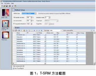 離子源溫度:300 ºC,燈絲電流為 25 µA,采用 T-SRM 方法, 無需分時間段。部分方法如圖 1 所示(總共 402 對 SRM 離子對):