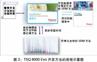 TSQ 8000 Evo 的整個實驗流程可以參考圖 2。TSQ 8000 Evo 自帶的 TraceFinder 軟件有一個數據庫,該數據庫包含常規(guī)三 重四極桿串接氣質上分析的 1000 多種化合物離子對信息,如農藥,環(huán)境污染物等化合物。所以,當我們需要完成手頭上化合物的方法建立時,可以首先參考數據庫中的離子對信息。數 據庫中查不到的化合物離子對信息,可以使用 TSQ 8000 Evo 特有的 AutoSRM 軟件來自動完成。