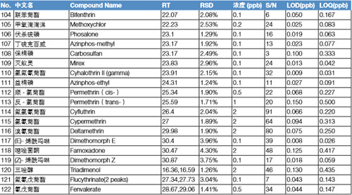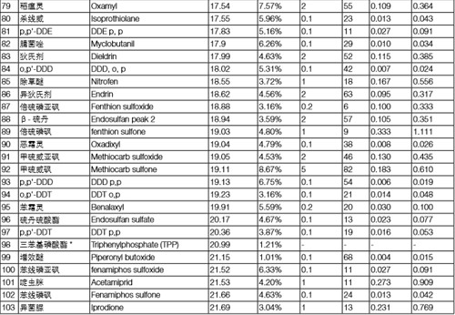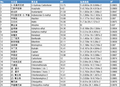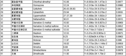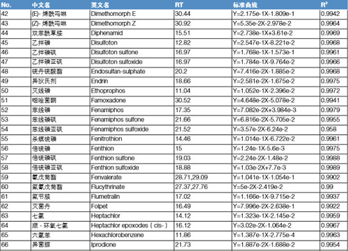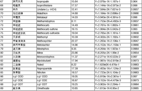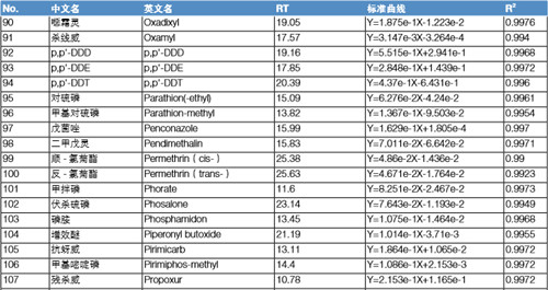 分別配置 5 ppb、10 ppb、20 ppb、50 ppb、100 ppb、200 ppb 的混標溶液,采用內標法定量,內標為莠去津或者三苯基磷酸酯(按 照保留時間來確定以哪種物質為內標,本實驗保留時間在 20 min 之前的化合物都以莠去津為內標,20 min 之后以三苯基磷酸酯為 內標)。下表列出所有 122 種化合物的標準曲線方程以及線性相關系數,可以看出,應用 TSQ 8000 Evo 快速掃描檢測這 122 種化合物,可以得到良好的線性方式,有利于定量的準確性。