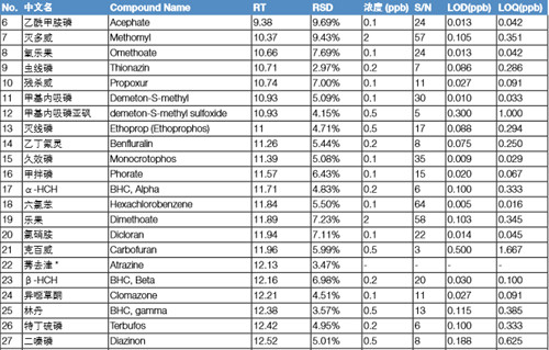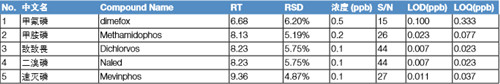 用10ppb的樣品重復進樣5針,檢測方法的重現性。所得的重現性結果如下圖所示,所有的化合物的重現性在1.01%-9.69%之間(如 表 2 所示)。分別配置100ppt、200ppt、500ppt、1ppb以及2ppb的樣品,按照S/N為3和S/N為10來估算化合物的最低檢出限及最低定量限。 各個化合物的 LOD 和 LOQ 如表 2 所示。