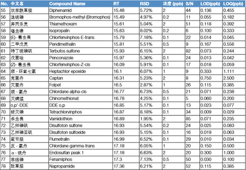 本實驗用 TSQ 8000 Evo 結合賽默飛世爾科技農殘分析色譜柱 (TR-pesticide II 30 m*0.25 mm*0.25 µm)分析煙草中的122種農藥殘留,得到了非常出色的結果。各種農藥的最低檢測 限在 0.004ppb-0.75ppb 之間,在 5 ppb–200 ppb 的范圍有 良好的線性,且用 10 ppb 樣品連續(xù) 5 針進樣,得到 RSD 在 1.01%–9.69% 之間,表明此方法具有良好的重現性。