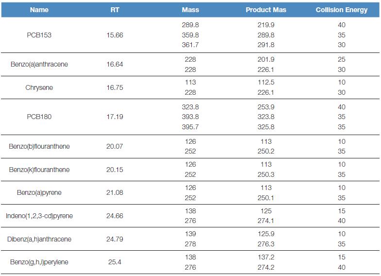 表1. 多環(huán)芳烴和多氯聯(lián)苯的質(zhì)譜條件