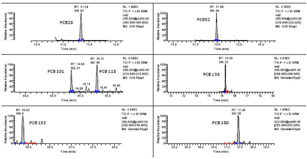 圖3. 0.05 μg/L 7 種多氯聯(lián)苯的色譜圖