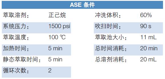 色譜柱:TG-5MS 30 m*0.25 mm*0.25 μm 毛細(xì)管色譜柱;Thermo ScientificTM DionexTM ASETM 350 加速溶劑萃取,配10 mL 不銹鋼萃取池(P/N 068087),60 mL 收集 瓶(P/N 048784)Thermo ScientificTM Reacti-Therm 氮吹儀(PN: 1003290002-00)試劑:正己烷:農(nóng)殘級(jí);
