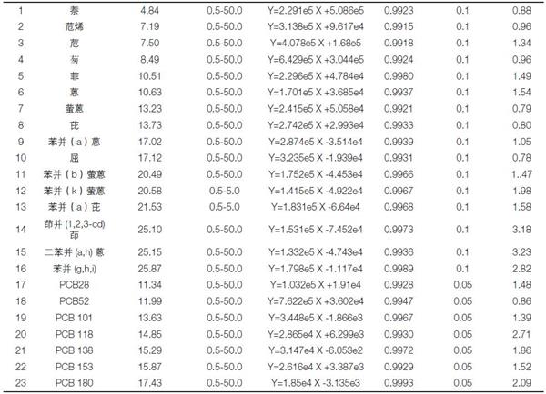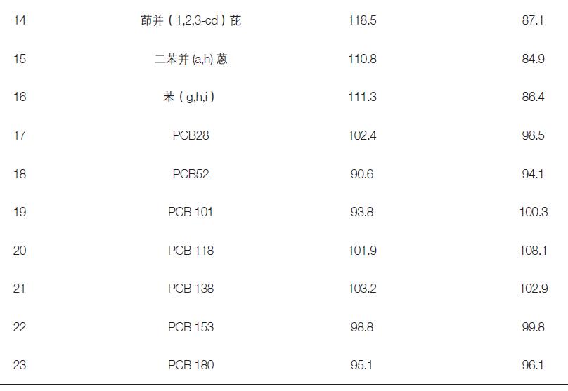 以S/N=3 為檢出限,S/N=10為定量限計(jì)算性噪比,檢測(cè)限譜圖示于圖2和圖3。由圖2可以看出16種多環(huán)芳烴的檢出限為0.1 μg/L,由圖3可以看出7種多氯聯(lián)苯的檢出限為0.05 μg/L。本方法的檢出限優(yōu)于其他文獻(xiàn)報(bào)道值,可保證樣品中23種有機(jī)污染物殘留的定性與定量檢測(cè)。