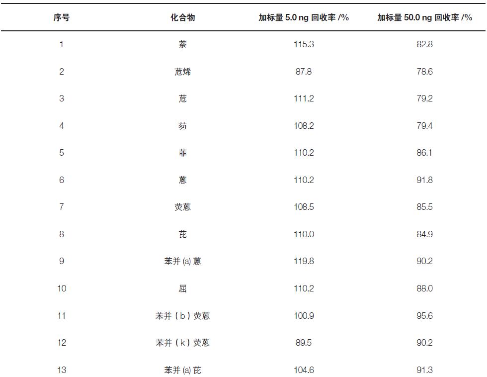 本實(shí)驗(yàn)采用空白石英濾膜進(jìn)行加標(biāo)回收率實(shí)驗(yàn),加標(biāo)量分別為5.0,50 ng,考察23 種目標(biāo)物的加標(biāo)回收情況。實(shí)驗(yàn)結(jié)果表明各組分的加標(biāo)回收率均在78.6-119.8% 之間,符合分析檢測(cè)的要求(表3)。