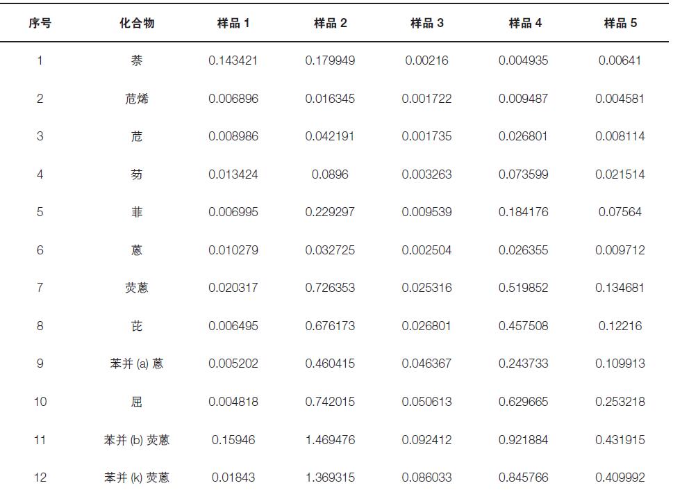 本實(shí)驗(yàn)實(shí)際樣品由北京環(huán)境監(jiān)測(cè)站提供,總共5 個(gè)樣品(樣品采集速率100 L/min。采集24 h)。按照本方法進(jìn)行分析檢測(cè)。實(shí)驗(yàn)結(jié)果表明,5 個(gè)樣品中均不同程度含有目標(biāo)有機(jī)污染物(見表4)。