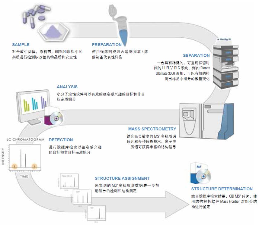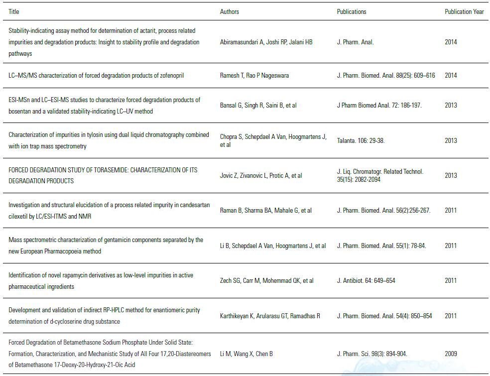 雜質(zhì)譜分析是指研究藥物中存在的已知和未知的雜質(zhì)的分布情況,分析藥物中雜質(zhì)的來源和去向,通過雜質(zhì)譜的研究,可以全面的評估藥物的安全性。對于藥物生產(chǎn)階段,雜質(zhì)譜研究可以在工藝過程中建立完整可靠的雜質(zhì)分析方法,對工藝的關(guān)鍵步驟監(jiān)控雜質(zhì)的變化情況,驗(yàn)證雜質(zhì)分析方法并轉(zhuǎn)移到QA/QC,對于藥物研發(fā)階段,需要對藝研發(fā)過程中的雜質(zhì)進(jìn)行鑒定和表征并進(jìn)一步確認(rèn)雜質(zhì)的來源,研發(fā)人員根據(jù)分析結(jié)果可以評價藥物的安全性和與原研藥的一致性,并根據(jù)雜質(zhì)來源進(jìn)一步優(yōu)化工藝,降低或消除雜質(zhì)的產(chǎn)生。