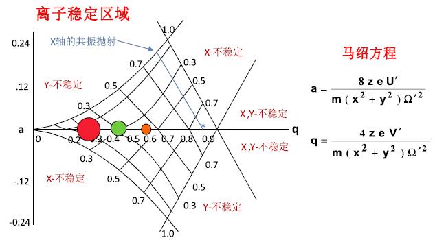 離子阱中的穩(wěn)定區(qū)域可以通過馬紹方程計算出來,化合物離子在特定的射頻電壓下按照特定頻率移動,增加RF 電壓, 離子的頻率(q 值)將會增加,逐漸提高射頻, 使離子從低m/z 到高m/z 逐漸依次離開,完成掃描。