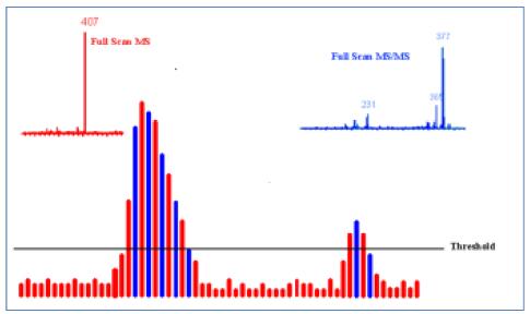 如下圖所示,離子阱通過一級掃描,獲得化合物質(zhì)譜信息,根據(jù)質(zhì)譜響應(yīng)強(qiáng)弱自動選擇母離子進(jìn)行多級質(zhì)譜掃描,一次進(jìn)樣即可獲得雜質(zhì)多級質(zhì)譜信息。