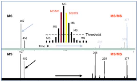 在下圖中,化合物m/z 452和m/z 407發(fā)生了共流出,開啟動態(tài)排除后,儀器首先對響應(yīng)較高的m/z 407進(jìn)行二級碎裂,然后將m/z 407 放入排除列表,在下一次全掃中,響應(yīng)較高的m/z 407 即作為排除項(xiàng),轉(zhuǎn)而選擇響應(yīng)較弱的m/z 452 進(jìn)行二級碎裂。所以在一個色譜峰內(nèi),即使有多個化合物存在,動態(tài)排除都能保證采集到每個化合物的多級質(zhì)譜信號。