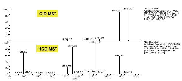 圖4. 阿德福韋酯在相同的 25%NCE水平下的CID & HCD MS2 譜圖