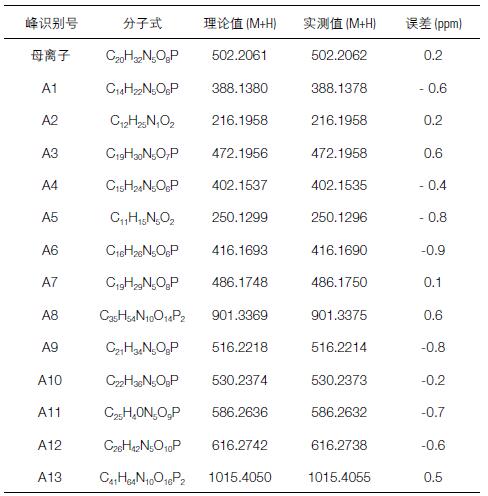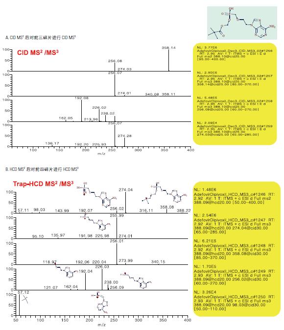 在本研究中,Sigma-Aldrich 所售的研究級(jí)阿德福韋酯(adefovir dipivoxil,ADP) 被用來(lái)作為模型化合物進(jìn)行API 雜質(zhì)分析。ADP 是廣泛用于慢性乙肝病毒感染的一種抗病毒處方藥。本研究中使用的LCMS 系統(tǒng)由Thermo Scientific AccelaTM UHPLC 以及 Velos ProTM 線性離子阱質(zhì)譜儀構(gòu)成。碎片信息通過(guò)結(jié)合應(yīng)用 CID 與Trap-HCD 解離技術(shù)獲得。數(shù)據(jù)處理通過(guò)軟件Mass FrontierTM 完成。