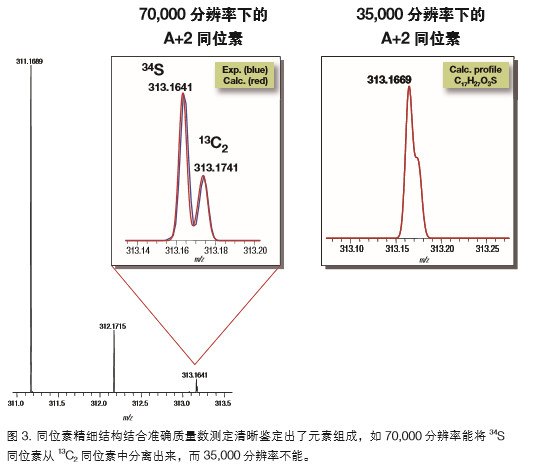 圖 2 顯示了N- 苯甲;-D5- 甘氨酸內(nèi)標(biāo)物的高質(zhì)量 LC-MS 數(shù)據(jù)。在質(zhì)量軸校準(zhǔn)后的25 到 35 小時(shí)之間采集血清 QC 重復(fù)樣的正離子模式數(shù)據(jù),展示了 UHPLC 分析時(shí)間內(nèi)優(yōu)異 的峰面積和質(zhì)量數(shù)測定的穩(wěn)定性;處的色譜峰寬為 3.6 s, 每個(gè)峰獲得了 15 次掃描。 圖 3 顯示了測定內(nèi)源代謝物的元素組成時(shí)分辨率為 70,000 的重要性。A+2 同位素( m/z 313)附近的展開圖中顯 示存在一個(gè) 34S,這在 35,000 分辨率下(模擬)是不可能發(fā)現(xiàn) 的,因?yàn)榉直媛瘦^低時(shí),13C2 同位素與 34S 是不能分辨的。