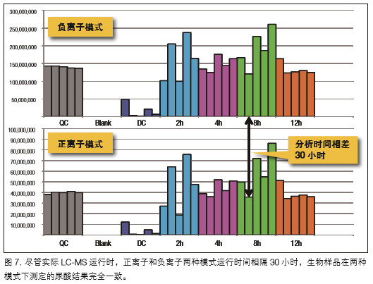 表 1 中的大鼠研究實(shí)驗(yàn)用于監(jiān)測禁食對大鼠代謝過程的影 響。圖 5 顯示了喂養(yǎng)大鼠控制樣組、混合 QC 樣和禁食 4、12 和16小時(shí)血清樣主成分分析(PCA)的高質(zhì)量聚類分析結(jié)果。結(jié)果清晰地顯示了喂養(yǎng)和禁食大鼠血清代謝組的區(qū)別,以及不 同禁食時(shí)間的代謝組差異。圖6 顯示了隨禁食時(shí)間變化增加 (Met 甲硫氨酸,20:4 FA 二十碳四烯酸)和減少(Pro 脯氨酸, 18:2 LPC 溶血磷脂酰膽堿)的代謝物。如圖6 所示,混合血 清 QC 重復(fù)樣中的每種代謝物均呈現(xiàn)極佳的重現(xiàn)性。因此,沒 有必要做技術(shù)性重復(fù)樣。圖 7 說明在實(shí)際 LC-MS 分析中,盡 管正離子和負(fù)離子模式的運(yùn)行時(shí)間相隔 30 小時(shí),血清中尿酸 的測定結(jié)果在兩種模式下仍然一致。研究證實(shí),該 LC-MS 平臺(tái)和方法非常耐用。從而推斷生物多變性是這些數(shù)據(jù)中噪音的主要來源。
