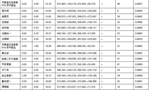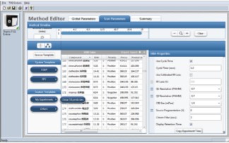 質(zhì)譜檢測(cè)使用TSQ Endura MS 串聯(lián)三重四極桿質(zhì)譜儀 的 tSRM 定時(shí)選擇反應(yīng)監(jiān)測(cè)功能(timed Selected Reaction Monitor)進(jìn)行,配備Easy-Max NGTM HESI 加熱電噴霧離子源。 包括保留時(shí)間、SRM 離子對(duì)、RF 電壓與碰撞能量等在內(nèi)的 tSRM條件,直接從TraceFinder軟件pQuan化學(xué)數(shù)據(jù)庫(version 1.0, pesticides Quantitation chemical database)調(diào)用(圖 2), TSQ Endura MS 儀器方法編輯為拖拽- 釋放式設(shè)計(jì),且支持 各種方法模板的靈活定制(圖 3)。根據(jù)農(nóng)殘不同的電離屬性,方法中正負(fù)電離模式來回切換。依據(jù)不同化學(xué)屬性的農(nóng)藥因色 譜行為而造成的峰寬不同,設(shè)定 tSRM 時(shí)間窗口為 1~5 min。除十三嗎啉、丙環(huán)唑等少數(shù)物質(zhì)外,其余絕大多數(shù)設(shè)定為 1 min。Q1 與 Q3 分辨率設(shè)定為0.7 FWHM,Q2 碰撞池氬氣 壓力為 1.5 mTorr。tSRM 掃描循環(huán)時(shí)間(cycle time)為 1.2 s。其余質(zhì)譜條件見下表。