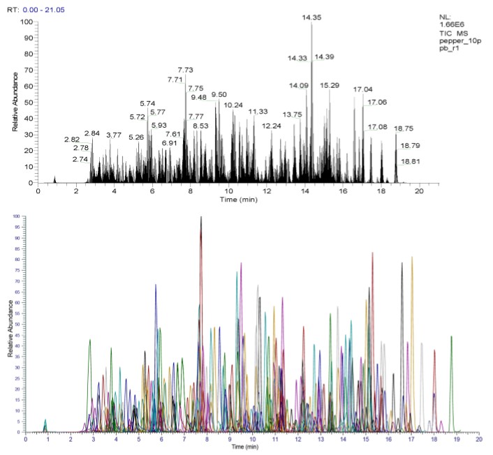 圖 5 上圖:菜椒基質(zhì)中 440 種農(nóng)殘同時(shí)檢測(cè)的總離子流圖,下圖:440 種農(nóng)殘的提取離子色譜圖(10 pg/µL)
