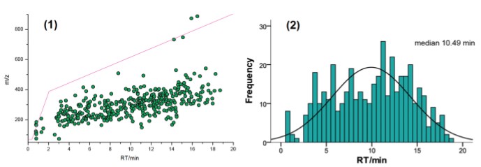 圖 6(1)農(nóng)殘精確m/z vs. 保留時(shí)間散點(diǎn)圖,(2) 保留時(shí)間的頻次分布圖