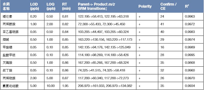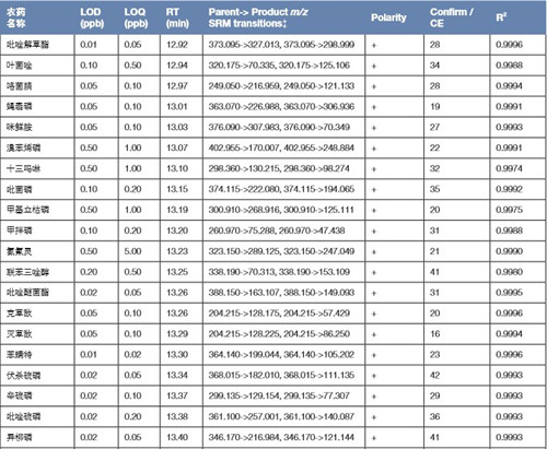 菜椒(bell pepper)空白基質(zhì)由美國(guó)California Department of Food and Agriculture 提供,基質(zhì)由15 g 菜椒勻漿物使用15 mL 乙腈,經(jīng)QuEChERS 方法提取獲得。配置基質(zhì)加標(biāo)樣時(shí),先取適量基質(zhì)加入1.5 倍體積超純水用以改善溶劑效應(yīng)。再取 農(nóng)殘混標(biāo),使用乙腈/ 水(v/v, 4/6)逐級(jí)稀釋,最后將加水后的空白基質(zhì)與對(duì)應(yīng)濃度點(diǎn)的標(biāo)樣溶液混合,充分渦旋混勻后, 得濃度為0.001、0.002、0.005、0.01、0.02、0.05、0.1、0.2、0.5… ~200 pg/µL(ppb)的一系列溶液。由低至高,每個(gè)濃度點(diǎn)重 復(fù)進(jìn)樣三針,用以測(cè)試農(nóng)殘?jiān)诓私坊|(zhì)中的最低檢測(cè)限(LOD) 與定量限(LOQ),每個(gè)農(nóng)藥的標(biāo)準(zhǔn)曲線在LOQ 到 200 pg/µL濃度區(qū)間內(nèi)繪制。