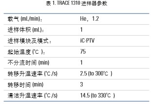 Thermo ScientificTM TRACETM 1310 氣相色譜儀被用于化合物 分離。該系統(tǒng)配備了 iC-PTV 進(jìn)樣器。表 1 和表 2 分別給 出了進(jìn)樣器條件和升溫程序。分析柱使用的是Thermo ScientificTM TraceGOLD TG-5SILMS 30m×0.25mm×0.25μm柱。