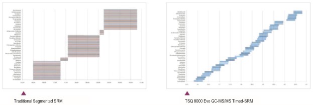圖1. 分段SRM(左)和定時(shí)-SRM(右)的采集時(shí)間表。定時(shí)-SRM能夠避免采集不必要的離子對(duì)(分段SRM方法中會(huì)出現(xiàn)這一情況), 從而更有效地利用弛豫時(shí)間。
